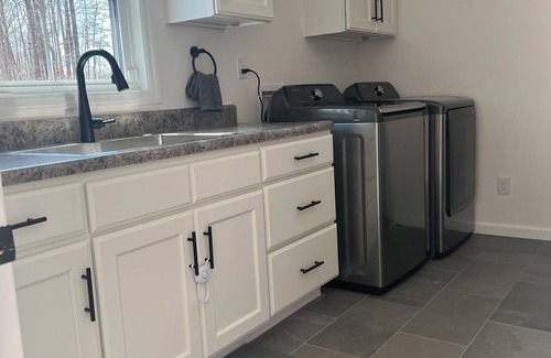 Grange Hall Retreat is a family friendly new construction home with plenty of space on a quiet wooded lot. 3 bedrooms with a tiny nursery (full size crib and changing table). Inflatable toddler beds and additional pack-n-play also available.