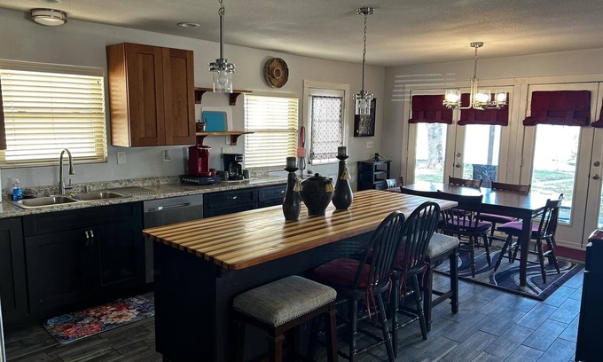 Discover the beauty of Granbury from this 3-bedroom house. This terrific property features 2 queen beds, 1 bunk bed, and 1 murphy bed, perfect for a wonderful stay. With amenities like a washing machine, WiFi, and heating, guests will feel right at home. The 3 bathrooms come equipped with a hair dryer and shower for added convenience. Enjoy all that Granbury has to offer when you stay at our place. Large fire pit overlooking your boat dock and lake view. Great for relaxing while the kids fish.