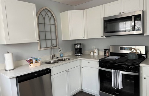 The open concept living, kitchen, and dining area is a perfect set up to keep everyone entertained! There is a dining table for four but we have extra chairs and outdoor dining available! The kitchen has new stainless appliances and a nice eat-in area with all the supplies you'll need to feel right at home!