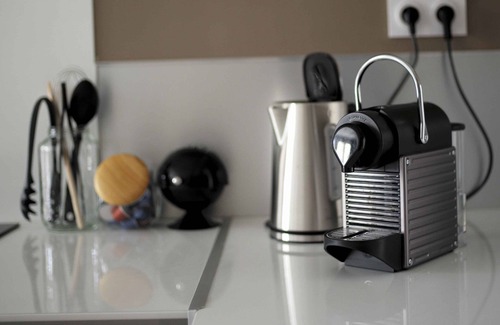 The kitchen is equipped with an induction hob, oven, microwave, toaster, Nespresso machine, kettle and large fridge with freezer