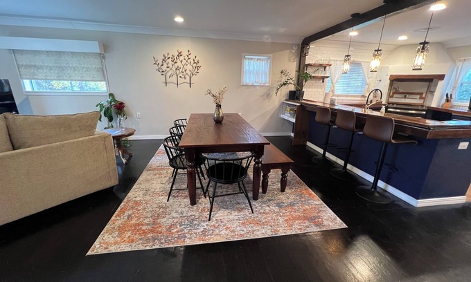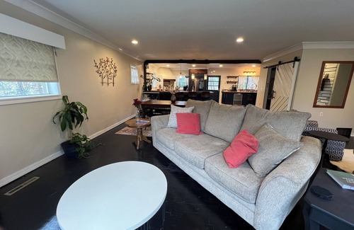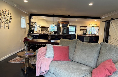 Exhale all your stress as you turn onto the beautifully paved driveway surrounded by gorgeous tall trees, as the sprawling front and back yards provide lots of shade and privacy. This unique property has recent updates of new lighting, new decor, and comfortable furniture. Kitchen is stocked with all you need to prepare meals - wine fridge and stainless appliances (stove/oven dishwasher, and french door refrigerator). Get a good night’s sleep in one of three bedrooms, each with a queen bed, brand new mattress and soft, inviting bedding. Two full baths, each with a bath/shower combo. Kids can enjoy ping pong or darts in the basement downstairs (also where the washer/dryer are located). Enjoy a glass of your chilled wine or a freshly brewed cup of coffee from our stocked coffee center. Grab one of our soft throws and sit on the quiet/private back porch or take a rest on the front porch while gazing at nature's beauty. When you do shower or soak in one of two tubs, don a hot towel from the towel warmer! Home is centrally located - 3 miles to JMU or downtown Harrisonburg, only a short drive to Massanutten ski resort and various Shenandoah river accesses for kayaking, or a bit longer to visit Skyline Drive for scenic drives and/or hiking!