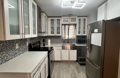 Cozy 3-bedroom in Massapequa sleeps 6. Features stainless steel appliances, gourmet kitchen, central air, stylish lighting, waterfall shower, fireplace, flat-screen TVs, office space, and in-unit washer/dryer. Enjoy backyard access with a grill. Located near pizzerias, buffets, ShopRite, parks, and beaches. Quiet neighborhood, perfect for work or family stays. Comfort, convenience, and style all in one!