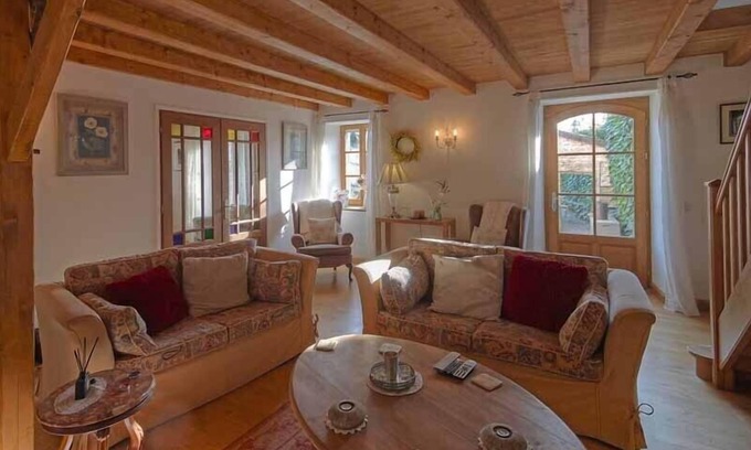 - Period, authentic features: original fireplace and double-sided wood burner, tiled floor, beams, exposed stone walls, feature bull's eye window and potagere.