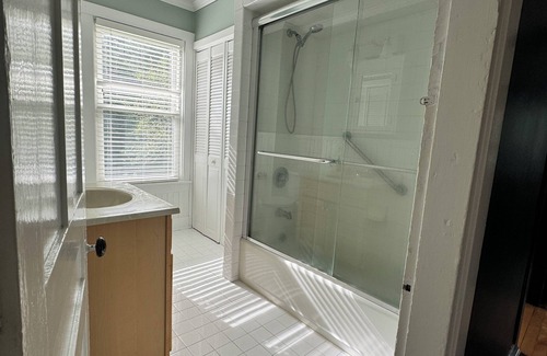 On the south end of the house, a small carpeted den overlooks the patio, providing the perfect spot for a cozy nap or to watch your favorite show on the new 40" smart TV. The Corduroy bean bag conveniently converts to a full bed if extra sleeping space is desired on the first floor. Upstairs, there are three inviting bedrooms, one doubles as a dedicated workspace. The Brook Room features a California king bed with a Purple mattress, 40" smart TV and Envi wall heater while the Fox and Llama Rooms each offer one twin bed with memory foam mattresses. The Fox room doubles as a workspace and is provisioned with an antique desk and chair with gleaming wood floors and bright natural southern light.