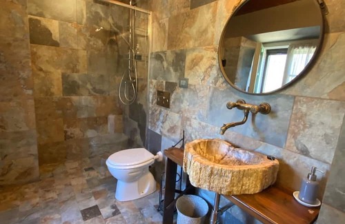 The Sanctuary Tuscany, direct book on google maps, a renovated hillside stone cottage overlooking the Gordana River with views of the Apennine mountains. Surrounded by nature and history this villa feels lost in the country yet only 7 minutes by car to the center of lovely Pontremoli for restaurants, shopping and the train station. Centrally located for day trips to Cinque Terre. The private grounds feature a natural pool, hot tub, fruit trees, walking paths, and a patio with fireplace/bbq.