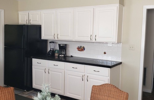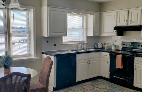 - Modern , farmhouse basement, suite, queen bed, efficiency , dogs welcome.