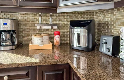 The kitchen is fully equipped with all cooking supplies as well as dishes , condiments, a dishwasher, full oven, fridge, stick blender, and other small appliances. There is beautiful island bar in the middle with stool as well as a great dinning table right beside a gas fireplace. There is a bathroom right beside the kitchen for your convenience.