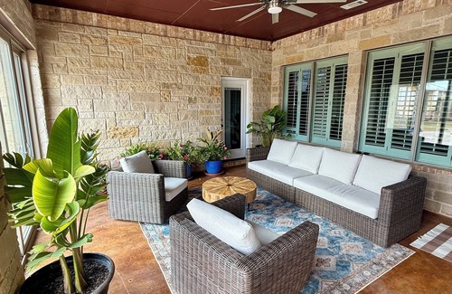 Consider this house your home away from home while you visit Midland. This home sits on a two acre lot. This nice property boasts 4 soothing bedrooms, each with a king bed for a restful night's sleep. With 4 bathrooms, including a bathtub for a relaxing soak, guests will feel pampered during their stay. An additional office space with a futon provides extra flexibility for your needs. In addition, HUGE backyard with a pool with a slide. The outdoor kitchen is spacious for those nice cookouts during your summer stays. Our place is equipped for both long or short stays to make your holiday one to remember. Pool is only available for the months of be MAY - SEPTEMBER and SPA is not available to guest, parties are not allowed.