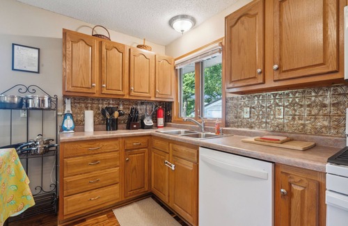 The back yard boarders a golf course which offers a park like setting. It’s peaceful here. The house is clean and updated. It’s free of clutter. It has four bedrooms one of which is an office. There is a finished basement with a large area with television and comfortable seating. There is a bedroom in the basement. There’s also a new washer and dryer for guest to use.