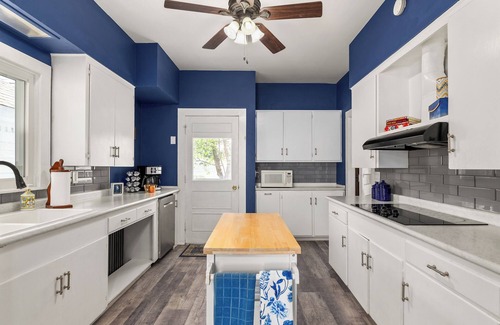 With hardwood floors, 15 ft ceilings, crown molding, and a sprawling porch, the 1901 retains its 1900’s charm. Once you cross the entryway, a full living room sits to your left with a large couch, Roku tv, and small dining space. To your right, a dining room holds a table long enough to fit 6 comfortably. Beyond that a small sunroom holds a few plush chairs where coffee or reading can be enjoyed. Moving to the back of the house, a full kitchen holds all the amenities you may need, coffee bar included! Back at the front of the house, if you look straight ahead, you will see the beautiful wood staircase that takes you upstairs to four bedrooms and one full bathroom. Here, a total of 10 adults can comfortably sleep. Two bedrooms feature a king bed, one bedroom holds a queen bed, and one is home to two sets of bunk beds. An additional full bathroom, closet and laundry room are located in the basement. (Note: there is no bathroom located on the main floor) The sprawling porch provides ample space to enjoy the view of the neighborhood and Freer Field. The private fully fenced backyard includes a small dining area and lighting to enjoy those nice summer evenings.