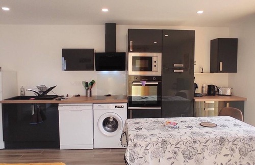 Entrance into the open-plan living area: equipped kitchen (induction hob, dishwasher, refrigerator/freezer, filter and pod coffee maker, kettle, toaster, washing machine, plenty of storage space, etc.), living room with a sofa and an 80 cm television, a bedroom for 2 people (140 x 190 cm bed) connecting to the bathroom (sink unit, 1.20 x 0.8 cm walk-in shower, hairdryer) and toilet.