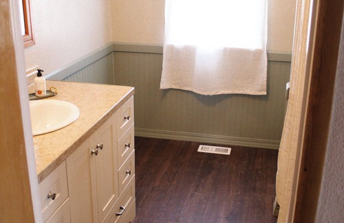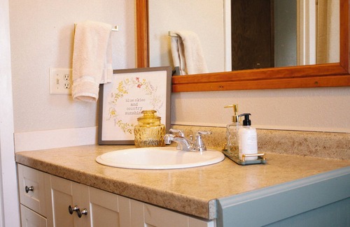 Enjoy the cozy bathtub in the single bathroom, along with amenities like AC, WiFi, heating, and a washing machine and dryer. The main floor has two bedrooms; one with a king bed, another with a twin bed. It also includes two separate living areas, a stocked kitchen, dining room with table, large laundry room, and bathroom.