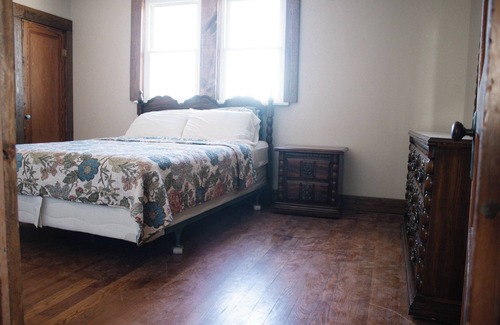 The top floor has three bedrooms; one with two queen beds, one with one queen bed, and one with one twin bed. Enjoy the view out of the large windows!There is plenty of space outside to enjoy the great outdoors. The front porch has seating to relax in while you take in the Kansas sunset. This historic family home is sure to be a peaceful and refreshing stay for all!