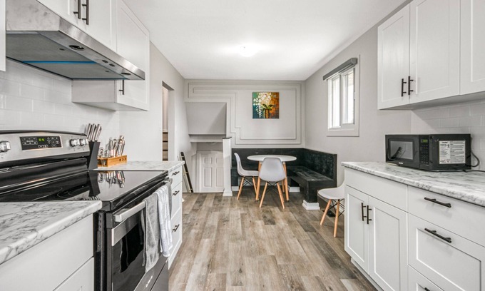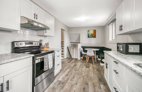 Fully stocked with all essential cookware items, drinking glasses, utensils, appliances, kitchen table, chairs, and anything else that may be needed to prepare a home-cooked meal.