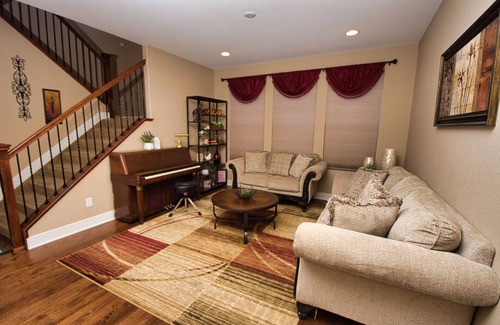 The basement includes a master suite (queen), a living area with a sofa bed, an office, two full bathrooms, and a beautiful bar area. The house is pet-friendly! Please note, there is no hot tub or spa available.