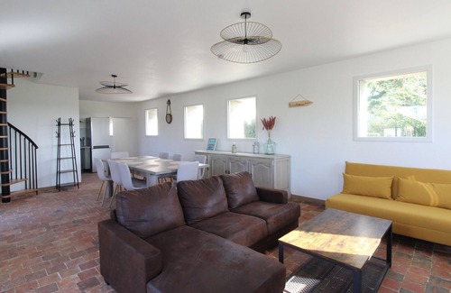 The cottage opens onto a large, bright 55m² living room with a fully equipped kitchen (oven, microwave, dishwasher, induction hob, etc.), a large dining area, and a comfortable lounge area with a television. Accessible to people with reduced mobility, the ground floor also features a bedroom with a 160x200cm double bed and a bathroom with an adapted shower and toilet.