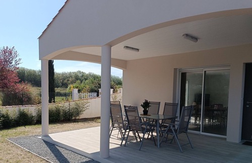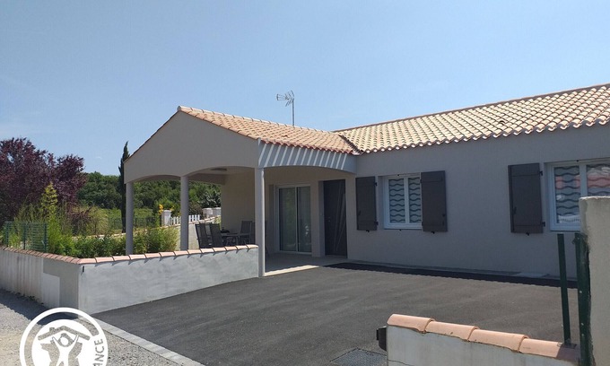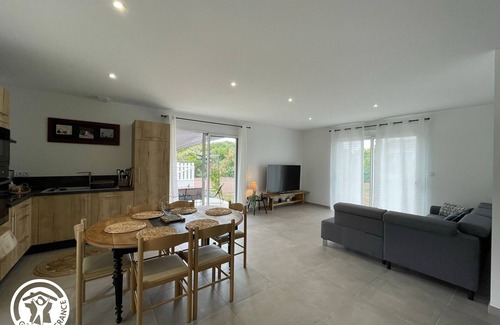 This new, single-story house, attached to a year-round residence, consists of a living/dining room/kitchen, three bedrooms (1 double bed, 1 double bed, 1 queen-size bed), a shower room/WC, and a pantry. Wi-Fi is available. Outside, there is an unfenced 450m² garden with two shaded terraces (garden furniture, table, chairs, deckchairs, and barbecue). Accommodation located in the immediate vicinity of the owners' house and a guest room (H85H031209). All-inclusive rate: heating, cleaning, bed linens, and towels.