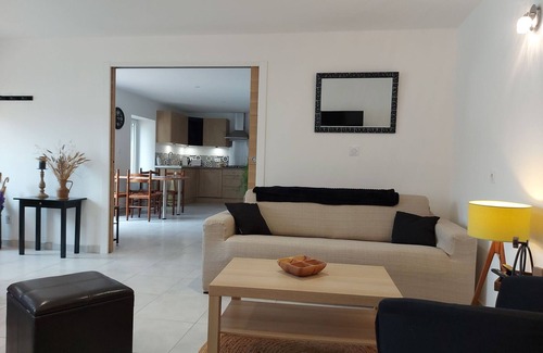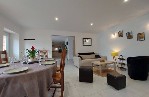 On the ground floor: an open kitchen, fully equipped to share good meals. A friendly living/dining room area with all the necessary comfort. A bedroom (140cm bed) with bathroom. Private toilets. Laundry.