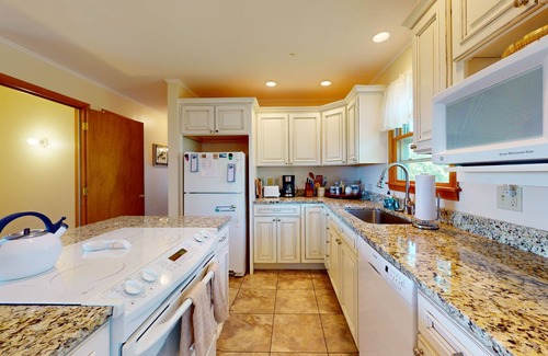Inside, the wood-lined living room offers a serene spot to settle down and tune into your favorite shows. The adjacent full kitchen has been fully updated and features granite countertops, a full suite of appliances, and a center island. The cottage's private washer/dryer and soft linens ensure that your every need is met.