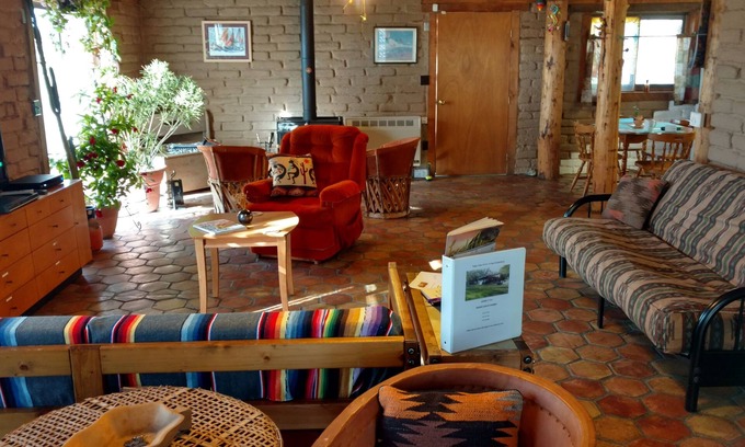 Authentic mud-construction adobe house in a quiet cul de sac neighborhood in the North Valley. Our home exhibits the culture of New Mexico, with traditional saltillo tiled floors, exposed adobe walls, vega ceilings, and a terrazzo tiled kitchen. You will have great views of the Sandia Mountains, hot air balloons and the Balloon Fiesta fireworks show. This is a perfect location for either a short drive to the Balloon Fiesta park, or for watching the balloons and/or fireworks from the comfort of your own patio or cul de sac. Enjoy your morning coffee in the patio atrium as hot air balloons fly over. You will be just minutes away from the Sandia Peak Tramway, and the New Mexico Rail Runner train station for a quick day trip to Santa Fe or a ride to Downtown Albuqueurque. The famous El Pinto restaurant is just around the corner, with delicious New Mexican cuisine and a long list of famous celebrity clientele. Our home has two bedrooms, one full bathroom, a fully stocked kitchen with dishwasher, washer and dryer, and a living room with TV, free Wifi and lots of board games and wood-burning stove (fold-down futon bed available if more than 4 guests; $10 per night, per person extra charge if more than 4 people). One bedroom has a charming Chiminea fireplace nestled in the corner. There is plenty of room for parking, and big grass yard for relaxing or playing yard games. Contactless checkin is available we have a smart key pad with your unique key code. Pets considered upon discussion with owner (additional -$25 per pet- fee will be charged if accepted).