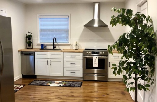 Come experience this private, charming and cozy cottage. A spacious living area with comfy couches and a fireplace for those cool nights. A bright and airy kitchen with all the basic necessities. Cozy bedrooms with ample space. A desk with wifi included for those needing to work. Formal dining indoors or you can entertain outside on the large deck with beautiful natural scenery. Rocking chairs added to the front porch for enjoying a cup of coffee or conversations with loved ones. It's very convenient to local eateries, shopping and downtown. A delightful cottage for your enjoyment.