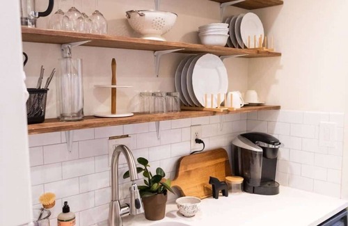 Guests are greeted by an intimate living room with a large smart TV (stream and enjoy your personal Netflix / Hulu / Amazon accounts), perfect for a cozy evening in. Walk through the living room and enter the fully equipped kitchen, begging to be enjoyed. Walk through the kitchen to find the cozy bedroom and en suite bathroom. Use the door in the primary to access the backyard.