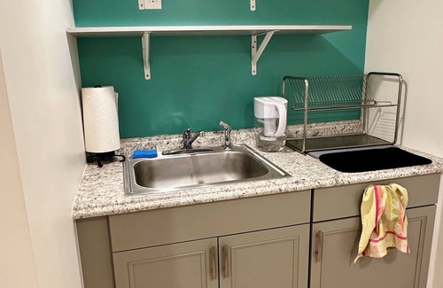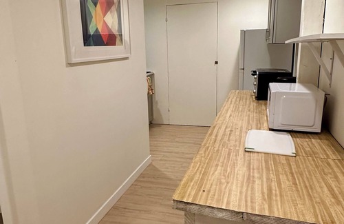 Discover this beautiful gem in Portland Oregon close to so many awesome places. The space is calming and features a large living room and bar, a bedroom with a queen bed and quality linens, and a closet, dresser, desk, and chair. There is a large 2nd room for dining, working, craft projects, or relaxing in. The kitchen has a good flow with amenities such as a coffee makers, a large refrigerator, microwave, toaster oven, air fryer, etc. The bathroom has a large walk-in shower and has room for storage. AC, heat, and internet, Apple TV included. A shared washer and dryer are also available. Your private entrance is through the back door of the house with stairs down to your place. You will feel at home here while you're traveling in Portland.