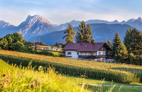 Experience pure recreation in a stylish and charming villa surrounded by a huge property. The house is located in one of the most beautiful landscapes in the Tyrolean Alps close to Innsbruck. Enjoy the rustic and pleasant atmosphere with mountain views and a lot of quietness. The equipment is stylish and cosy. An ideal accommodation for families with children, and for anyone seeking for relaxation. The house is divided in two separate living areas. One of those is available for rent. Please see the pictures. The apartment (200 m2) consists of 3 floors. The separate entrance leads to the garden and has a small balcony as well as a comfortable sitting area in front of the house with a panorama view of the mountains. As the location is calm with little traffic, comprises a large garden and is surrounded by fields, the house is also very suitable for children that can move around freely.