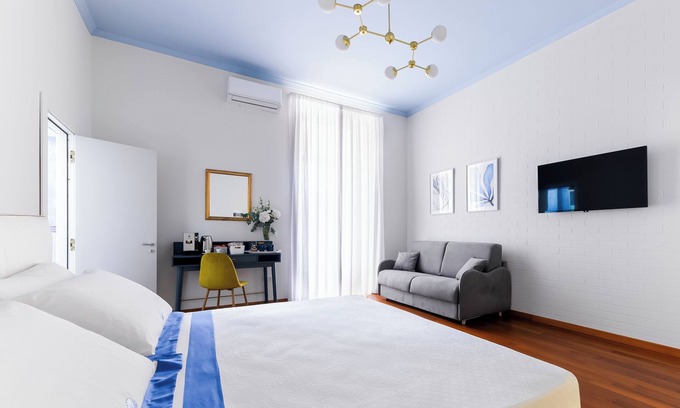 Our apartment is designed to offer an exclusive and comfortable experience. Recently renovated with attention to detail, it combines traditional Neapolitan elements with modern conveniences, creating a welcoming and refined space for families and groups of friends. The apartment can accommodate up to 10 people, thanks to 3 spacious bedrooms: two triple rooms and one quadruple room. Each bedroom is furnished with a king-size double bed and an Italian-made sofa bed, offering ample space for everyone to relax.