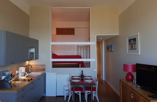 On stage, in an old Palace overlooking the sea and beach huts, playpen 37m2 apartment, sleeps 4. Magnificent sea views through a large window the apartment has high brightness, Apartment completely renovated with lots of charm fitted kitchen (microwave, stove, fridge, coffee maker, kettle, dishwasher ...), living room with New sofa and excellent bed, separate bedroom with a 140 bed, shower room. Television (DTT) Location possible mid-End Week or (2 night minimum).