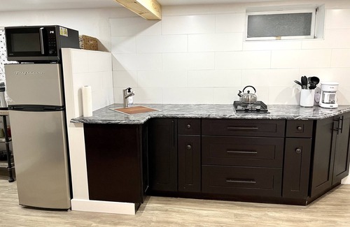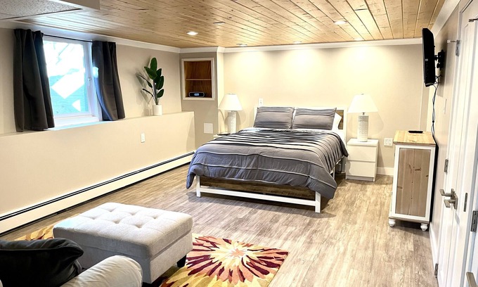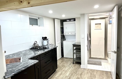 The apartment is clean and modern. The kitchen has everything you need with granite counter tops, 2 burners, and a convection/microwave/air fryer combo. The bedroom is a comfortable and relaxing space with black out curtains and a cozy down comforter for days you want to sleep in. The bathroom is modern and stylish with a shower, toilet, and vanity. Private washer and dryer in unit along with a/c and heat. All utilities included, including wifi. The TV has a Roku with Netflix, Prime Video, Disney + and many other channels. The apartment is on the lower level of a family home with 5 steps to the entrance. There is parking for one car.