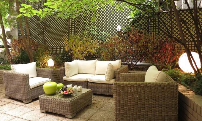 The 690 Sq Ft terrace, in addition to the many trees and plants, has a dining area for 4 guests, and a sitting area with sofa and armchairs.