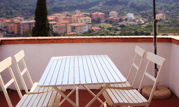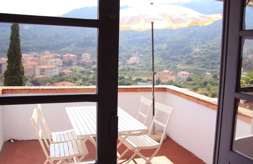 Lovely 100sqm apartment with stunning views of the Gulf of Finale Ligure, the apartment consists of a large room with kitchen and terrace, one double bedroom, bedroom with three single beds and bathroom with shower