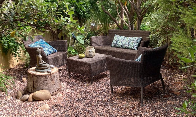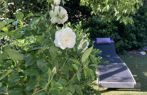 The independent single-storey studio has a private garden with a dining area, garden furniture and deckchairs.
