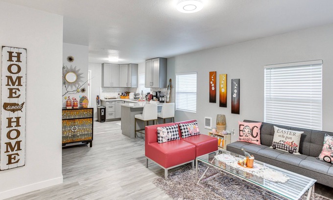 INDOOR LIVING: Smart TV, open floor plan, breakfast bar w/ seating, karaoke machine w/ microphone