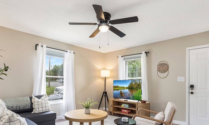 Start your mornings with complimentary coffee and tea! The two bedrooms are equipped with ceiling fans for added comfort. The couch pulls out for additional sleeping arrangements. Fresh towels, linens, shampoo, conditioner, body wash, and hand soap are provided for each guest, and hairdryers are available on the property.