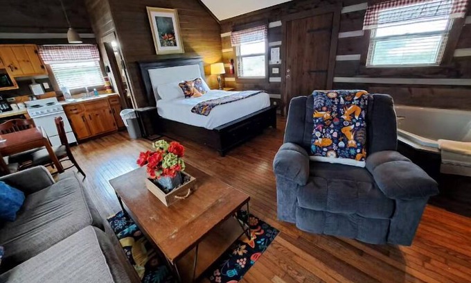 The cozy, open design of the cabin invites you to kick back and truly escape. Inside, you'll find a queen-size bed, a comfortable couch, and cable TV, providing all the comforts of home while surrounded by nature. After a day of exploring, indulge in the large jacuzzi tub, the perfect way to unwind and enjoy the quiet beauty of the area. The fully-equipped kitchen, complete with a stove, oven, microwave, and small refrigerator, makes it easy to prepare meals and snacks during your stay.