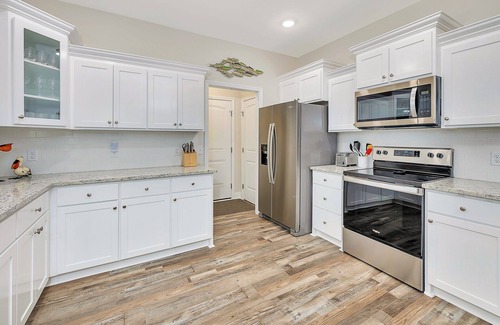 Welcome to your home away from home! Our bungalow boasts an open floor plan, making it perfect for family gatherings or a getaway with friends. The chef's kitchen is fully equipped for all your culinary adventures, and the comfortable dining room table invites you to share meals together.