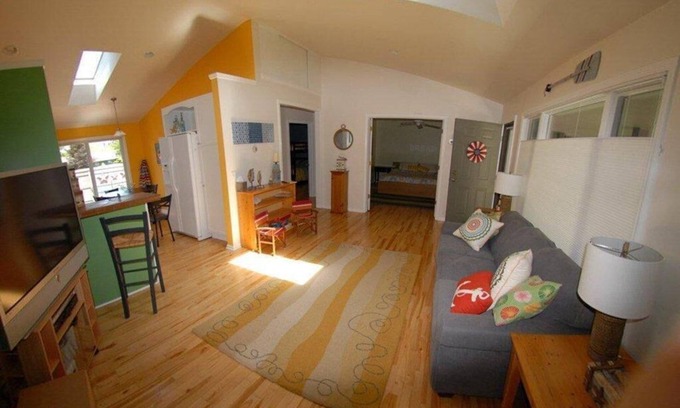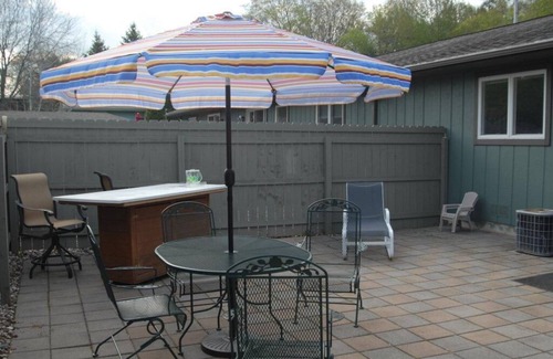 Two bedroom, one bath condo comfortably sleeps 6. Large private deck/patio with expansive grassy common area. A fully equipped kitchen, dishwasher, in-unit washer/dryer, central air, skylights, cable, DVD players, wifi, gas grill and all linens provided. Step out back to relax and barbecue on your private patio.