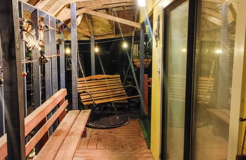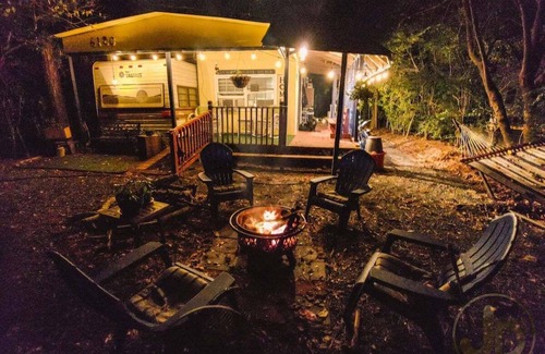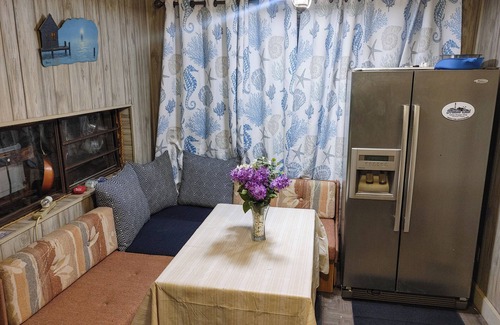 This is a rv with an addition and a covered porch. Comfortably sleeps 3 but can fit up to 5. There is one private bedroom with two twin beds and a privacy curtain. There are also 3 futons for sleeping, one in the rv and two in the living room of the addition. There is plenty of room in the yard to pitch a tent if so desired, also plenty of trees to hang a hammock. There is a bathroom in the rv but it is for emergencies only, there is a public bathouse 50 feet behind the property and another at the clubhouse which is about 100 hundred yards down the street. Linens and towels are not provided and you must bring your own. There is a beautiful new coin operated laundry/bath house near the front of the community.