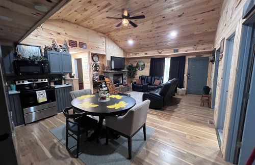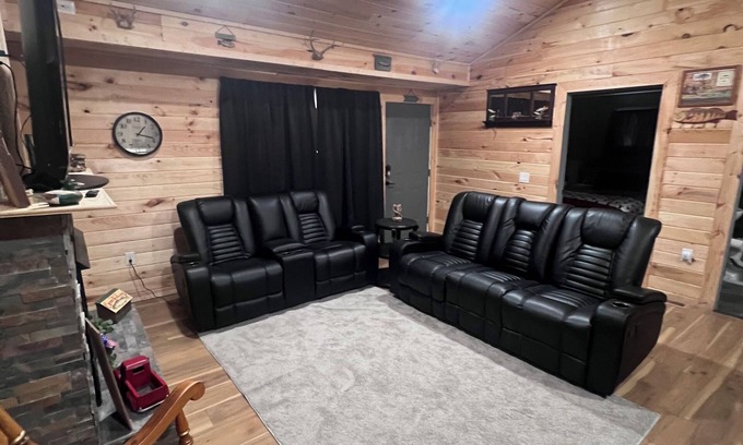 Inside, the cabin offers all the comforts of home with a fully equipped kitchen, cozy living areas, and comfortable bedrooms. The rustic charm is paired with modern amenities to ensure your stay is as comfortable as it is enjoyable.