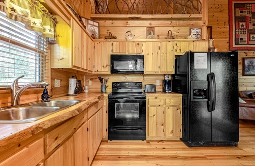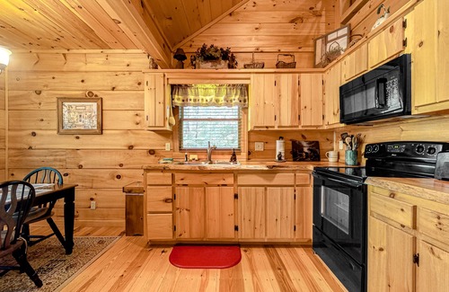 The open kitchen features full-size appliances and an eat-in area for a true bunking-in-the-cabin feeling. Settle in the comfortable downstairs bedrooms - one featuring an en suite bathroom. This cabin on Fightingtown Creek features seasonal mountain views, and there's room for everyone to enjoy them.