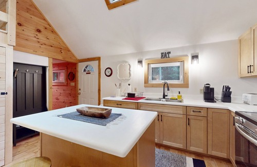 Escape to our peaceful cabin getaway in central Maine, where the sounds of loon calls and the quiet setting near Lake Cochnewagon create the perfect backdrop for rest and relaxation. Tucked into a private, wooded area just off the water, this cozy home offers a welcome retreat from the hustle and bustle of everyday life. Unwind in the hammock on the wrap-around deck or relax in the open living room, featuring skylights, hardwood floors, and warm knotty pine walls.