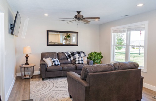 Immerse yourself in the serenity of Cannelburg's countryside while enjoying the comfort and convenience of a brand-new vacation rental. Unwind in the beautifully decorated space, where modern comfort meets a charming country aesthetic. Curl up on the comfortable couches and enjoy a movie night on the big-screen TV. Gather around the firepit in the backyard and roast marshmallows under the starry sky! Book your stay today and experience the perfect blend of relaxation and slow-paced living!