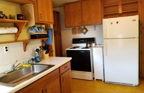 The first floor has: an open floor area for the living/family room; bedroom (queen bed); full bath; fully equipped kitchen with stove, dishwasher, microwave, refrigerator, keurig and regular coffee maker; laundry room with washer and dryer; large outside deck with dining table for 10-12 and gas grill; large screened in porch.