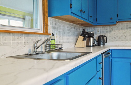As you enter the house, you will be welcomed into a detached Sunroom featuring a foosball table and seating area with board games. Through the Sunroom, is the fully stocked kitchen / dining room outfitted with retro inspired interior decor.