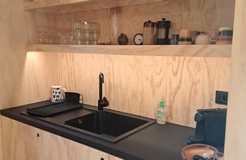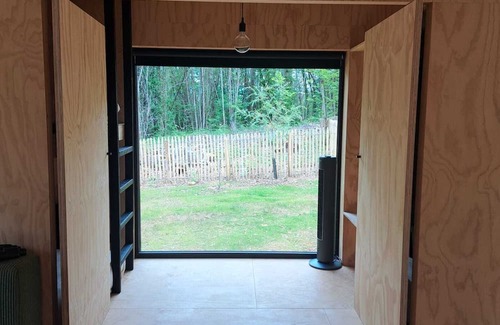 Designed with comfort and nature in mind, the cabin features large sliding doors that open to stunning views from every angle, filling the space with natural light. Inside, you’ll find a stylish, open-plan living area with warm wood accents, clean lines, and cozy furnishings. The fully equipped kitchen and dining space make it easy to enjoy meals indoors or on the terrace surrounded by nature.