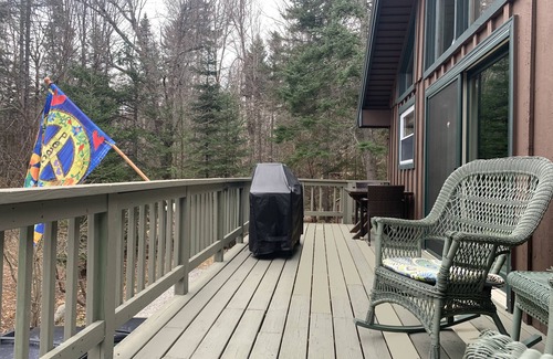 This home has 2 bedrooms, 2 bathrooms, a loft, and a bonus room off the mudroom, which provide ample room for 6 guests to stay comfortably. There is a spiral staircase from the mudroom to the main floor. The loft area with 2 twin beds is popular with the kids and the 2 bedrooms with queen beds are perfect for couples and single adults. The large wall of windows allows in plenty of natural light and views the gorgeous wooded landscape from the comfort of inside. The deck has plenty of room to hangout and BBQ with your family.