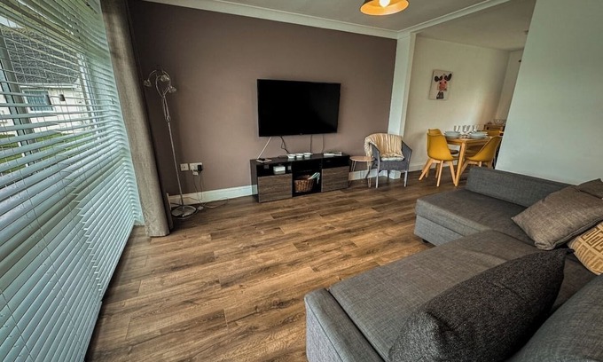 Bright and airy open-plan living space with comfortable seating, a flat-screen TV, and a dining area for family meals.