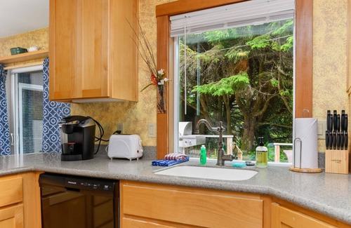 The full kitchen is stocked with all the equipment you'll need to make a delicious meal together, including a dishwasher, blender, and slow cooker. The living room is perfect for coming together - just turn on the electric fireplace and enjoy a movie on the big-screen TV. A musically inclined guest can plink out a tune on the electronic keyboard. There's plenty of comfortable seating for kicking back, and the wide row of windows will let in mellow coast sunlight. Play your favorite tunes on the CD player while you sip on coffee straight from the French press. Coastal vibes rule at this lovely home.